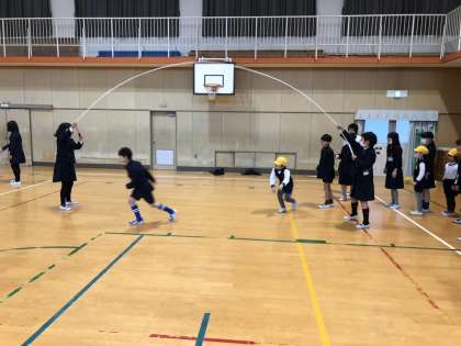 来年1年生と6年生になる子で交流しました。小学校ってどんなところ?などの質問に答えたり、一緒になわとびをして楽しみました。