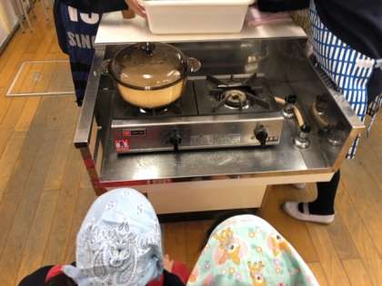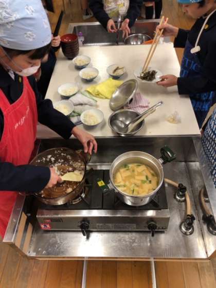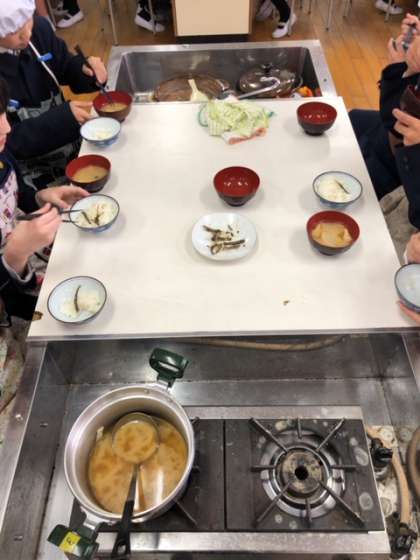 調理実習で、ごはんとみそ汁を作りました。ガラス鍋でご飯が炊ける様子を観察し、みそ汁の出汁のとりかたも体験しました。