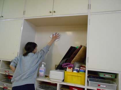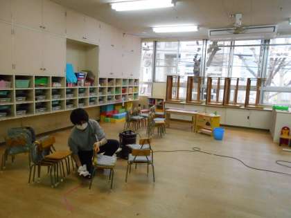 中大江幼稚園生・保護者のみなさま、元気にお過ごしでしょうか?中大江幼稚園では、昨日から全館清掃・消毒作業を行っております。今日は主に保育室の消毒を行いました。