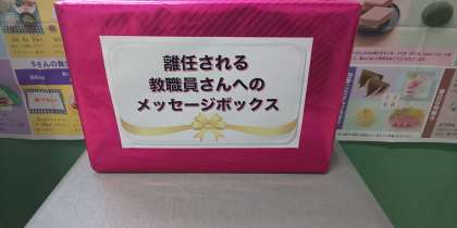 小学校内の掲示の横へ写真のように設置させていただいています。ご異動される小学校幼稚園教職員の方々へメッセージのある方は、こちらの箱にお入れください。