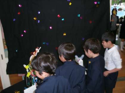 たかが幼稚園と思っていたかどうかは知れませんが、下の写真の「宇宙」をテーマにした作品群を作った部屋は3歳児だと聞かされた1年生の子どもたちは、「えーっ!すごーい!」と絶句していました。