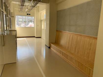 ここは3階です。ろうかには、木でできたベンチがあります。