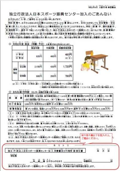 教科書等配付時にお渡ししております『独立行政法人日本スポーツ振興センター加入のごあんない』は、4月中に学校へご提出ください。学習教材配付日に持ってきていただいても結構です。