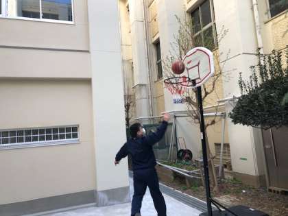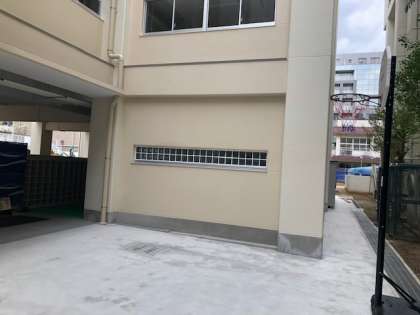 あたらしい校しゃとこうどうとの間に小さな広場があって