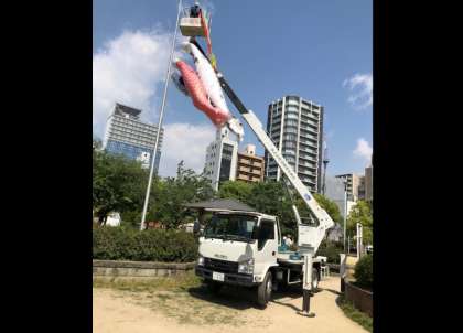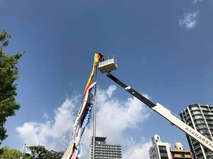 高所作業車で絡みついていた吹き流しを回収して頂きました。