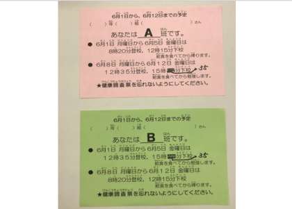 さて、本日、もしくは明日の登校日にて、6月1日からの分散授業のA班とB班に分ける紙をお配りします。(きょうだいが同じ時間帯になるように設定しています。)