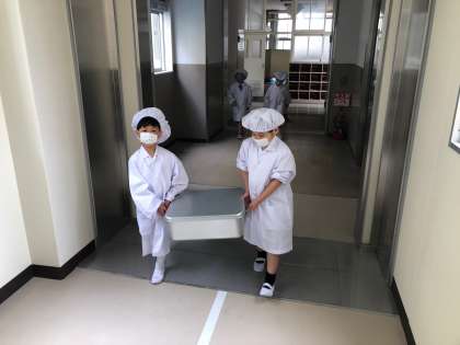 配膳は、感染防止のために今は先生が行いますが、