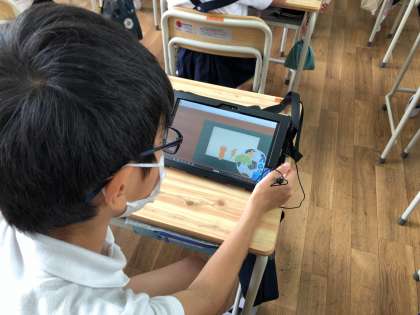4年生のプログラミング学習です。自分でプログラミングを作ってキャラクターを動かしていました。子どもはコツをつかむのが早いです!
