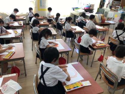 1年生の図画工作の時間です。パスを使って「わたしだけのおひさま」を描きました。いろんな色のいろんな形のおひさまを思い思いに描いていました。完成が楽しみです。