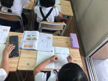 2年生の算数のようすです。身のまわりの長さを実際に計測してみる学習です。測る前に自分でどのくらいか予想をしています。長さの量感を養う活動です。