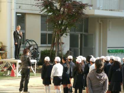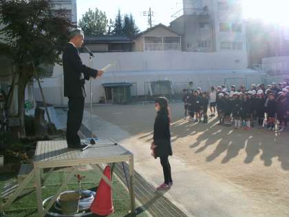 今朝の児童朝会。初めに、校長先生から絵画展で大阪市長賞に入賞した児童への表彰がありました。続いて、昨日の地域もちつき大会を通して、みんながもちつき大会で楽しく過ごすことができた陰には、早朝から寒い中、大勢の地域のボランティアの方々が子どもたちのために一生懸命に働いてくださったからだということに感謝の気持ちを忘れないようにと話されました。また、先週嬉しかったのは、学校で子どもたちから「ありがとう!」の声がよく聞こえてきたこと。たとえば職員室で2年生が、九々の暗唱を聞いてもらった先生に「ありがとうございました!」と大きな声で言えていたのも感心した。自分の気持ちを素直に声に出していける人になろうと話されました。