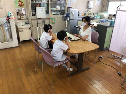 2年生の聴力検査のようすです。ヘッドホンから流れる小さな音が聞こえるかを検査しています。待っている人も、しっかりやり方を見て覚え、すばやく検査を終えることができていました。