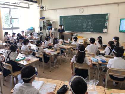 3年生の音楽のようすです。先生が演奏する短い曲に使われている音階を当てるゲームをしていました。速いテンポの曲や複雑な曲でも、「ドの音や!」「レとシ!」と音階を言い当てていました。