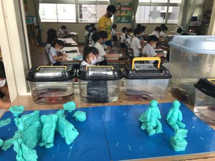 ロッカーの上には、生活科の学習でみんなで観察をしているザリガニと、