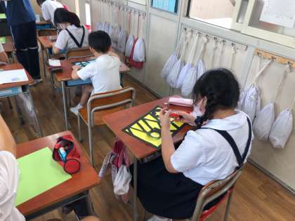 4年生の図工のようすです。以前も紹介した自分の名前をモチーフにした作品が完成に近づいてきました。アートナイフで上手に切り取った名前の部分を明るい色の台紙に貼り付けると・・・。とてもクールな作品に仕上がっています。