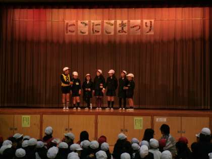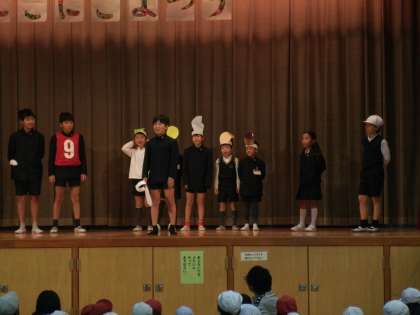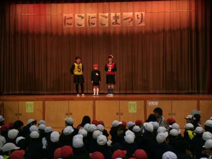 今朝の集会では、土曜日の「にこにこまつり」のお店の出し物の紹介を、各班ごとに行いました。呼び込み係の児童がわかりやすく説明したり、班の全員の児童が登場して楽しいコントを披露したりして趣向を凝らした楽しい発表が続きました。にこにこまつりが近づくにつれて、子どもたちもにこにこ顔になってきました。