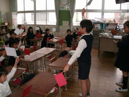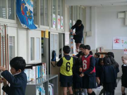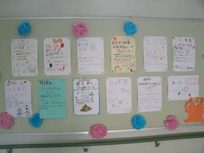 いよいよ明日が「にこにこまつり」の本番。土曜授業で保護者も一緒に参加することも想定して、自分の役割の練習や飾りつけなど、限られた時間いっぱいまでお店の準備作業に真剣さが漂っていました。