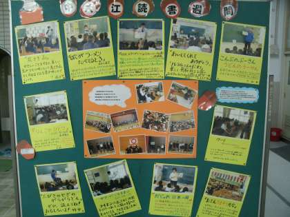 今日の土曜参観に来ていただいた方はご覧になったことと思いますが、11月の中大江読書週間中の集会での様子や図書委員会の児童の活躍などとともに、先生による教室での読み聞かせの様子も掲示されています。
