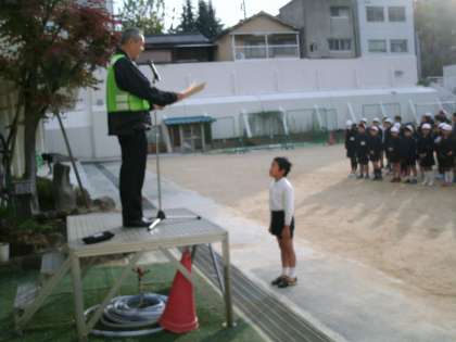 今朝の児童朝会。初めに、校長先生から絵画展で防火図画コンクールに入賞した児童への表彰がありました。そして、地域の「中大江安全見守りたい」の方々が日頃の子どもの見守り活動に対して、大阪府から表彰を受けたことを紹介されました。そして、皆さんがこうして安心して学校生活を送れるのも、冬の寒い日も夏の暑い日も、交差点に立って見守り活動をしてくださっているお陰であることに感謝を忘れず、お会いした時には元気よくあいさつをして「ありがとうございます」という気持ちを伝えましょうと話されました。