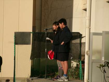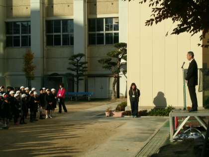 今朝の児童朝会。初めに、校長先生から高齢者大学校より手作りの英語のプレ−トを戴いたことの紹介がありました。また、校門前での児童の服装の様子から、寒さに負けず登校時にきちんと学校生活を送る心構えができ、きまりを守ろうとしている姿勢が素晴らしいと話されました。