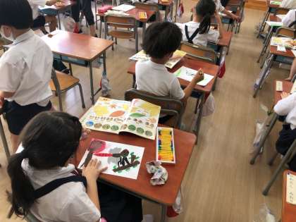 3年生の図画工作です。前の時間に作った「カラフルフレンド」が