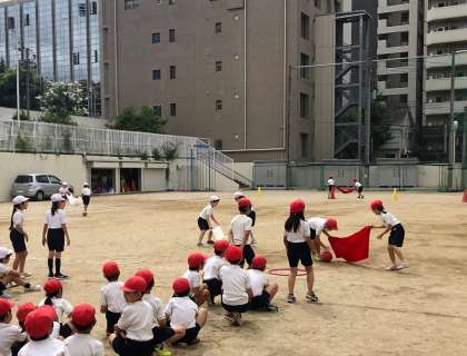 ペアで協力して、ボールを上手に運ぶ競争です。