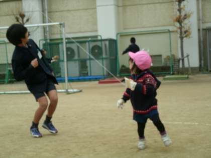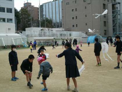 今日は6年生の児童が中大江幼稚園へ出向き、手作りのたこを一緒に作り、そのあと運動場で凧揚げをして遊びました。6年生のお兄さんやお姉さんたちが園児たちに少しでも喜んでもらおうと、凧を高く揚げようと試みて一生懸命に運動場を駆け回っていた姿が心に残りました。