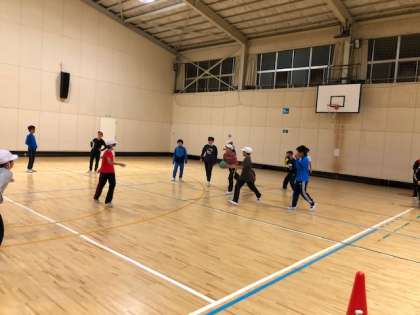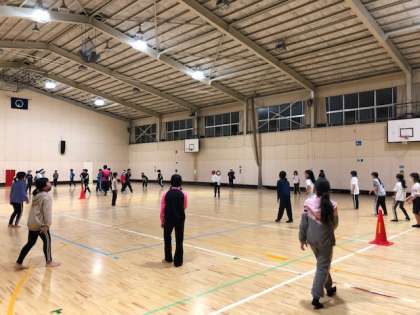 5年生は6年生の食事をとっている間、体育館で食後の運動です。