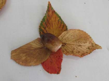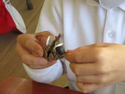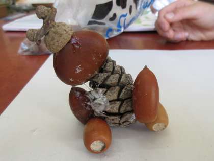 集めてきたドングリや松ぼっくり,葉っぱなどを使って,かわいい作品を作りました。