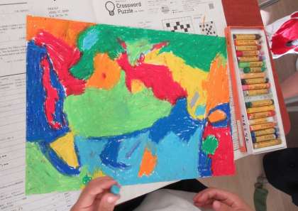 3.割りばし箸や竹串で絵を描と,黒が削られて下からきれいな色が出てくる。