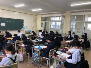 2枚目:国語の時間です。現代に受け継がれている和の文化をタブレットや本から調べてパンフレットにまとめているところです。