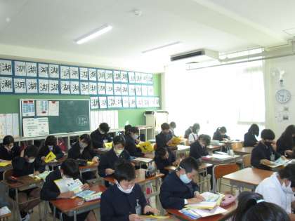 6年生の手元には黄色い表紙の冊子が…来週に迫った修学旅行のしおりです。実行委員の子どもたちが頑張って中のページを作ってくれたものが完成しました。配られると中身を必死で見る子どもたち…みんな嬉しそうです。