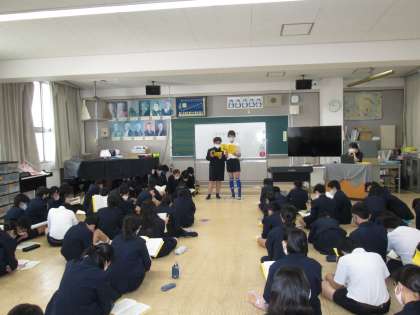 その後、修学旅行説明会をしました。実行委員の子どもたちを中心に、持ち物や注意事項、しおりへの付け加えなどを伝えてくれました。最後には、宿舎、水族館や遊園地等について、スライドを使った説明もありました。