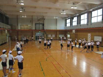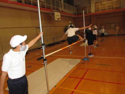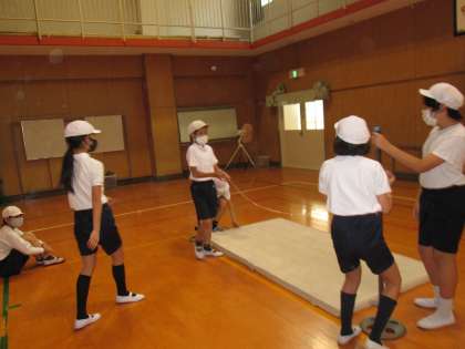 体育科では、講堂で走り高跳びの学習をしています。中学年でも取り組んだため、助走やバーを跳び越す動きが身に付いています。でも、体が成長した分、前とは感覚が違ったみたいで悪戦苦闘する子どもの姿がありました。バーが怖く感じる子どももいました。そこで、グループで話し合い、バーの代わりにゴムを選んで練習していました。課題に合わせて場を工夫するのは素晴らしいですね。課題はみんな違いますが、友だちと協力してちょっとずつ課題を解決していきましょうね。