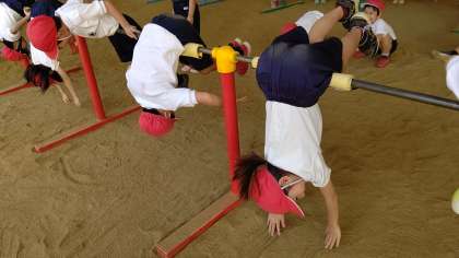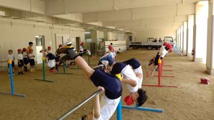 体育の時間に,鉄棒遊びをしました。自分に合った高さの鉄棒を選んで,つばめ,前回り下り,布団掛けなどに挑戦しました。