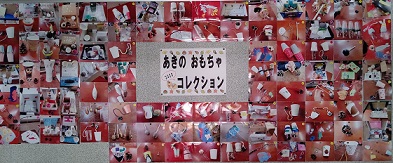 毎月子どもたちの作品を掲示していますが,今回は1年生全員の作品(秋のおもちゃ)を写真にとって掲示しました。