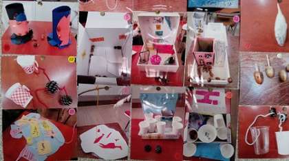 1組=赤色,2組=黄色,3組=桃色のシールに出席番号を記入したものを写真に貼っています。お子様の作品を探すときの手掛かりにしてください。
