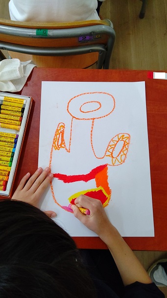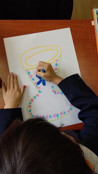 「魔法の壺は,どんな形かな?」と考え,魔法のランプの様な形や,ハロウィンのカボチャの様な形,ハート型など,思い思いの壺を描いた後,中に模様を描きました。写真は作成途中ですが,出来上がった作品は教室に掲示しています。