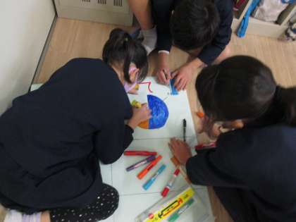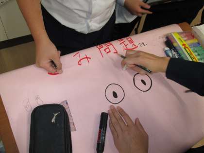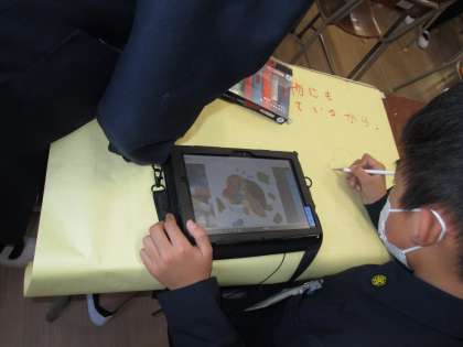国語科「町の未来をえがこう」の学習では、「自分たちの町の未来について考え、プレゼンテーションをする」ということがめあてとなっています。説明文『町の幸福論』を読んだあと、筆者の論の進め方や図表やグラフの使い方を学習しました。そして、グループで町作りについて調べ、提案を考えました。タブレット端末の「ノート」にまとめ、模造紙を使ったポスターにも簡単にまとめました。自分たちの考えがより伝わるように工夫しています。