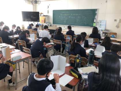 2枚目・図画工作の学習です。鏡の特徴を生かして楽しい世界を表現します。鏡を立ててイメージを膨らませながら作りはじめました。