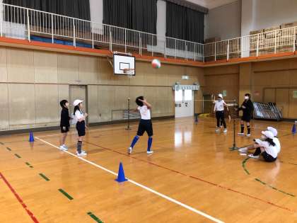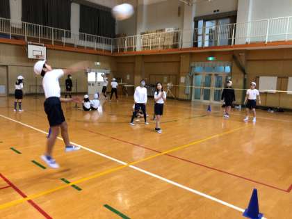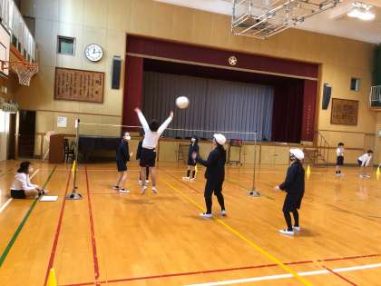 体育でソフトバレーボールをしています。ルールを自分たちで考えてミニゲーム開始!サーブやアタックが決まったり、ブロックをしたり、うまくキャッチできたりすると歓声があがります!