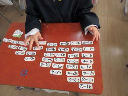 今日は、「ひきざんカード」を使った学習です。机上にカードを並べたり、「5」や「9」など、言われた答えのカードを見つけるゲームをしたりしました。