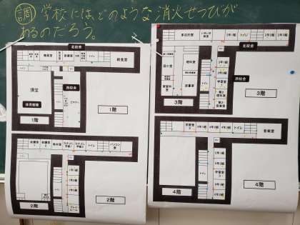 学校にある消防設備を調べました。消火器や火災報知器、防火扉など、学校にはたくさんの設備があることが分かりました。