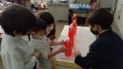5種類のペットボトルに入った赤い水をじっくり観察し、どれが一番多いか予想します。