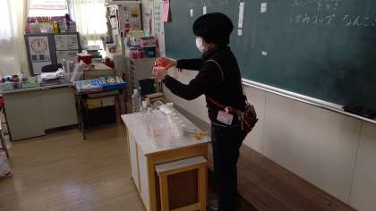 かさのくらべ方を考え、紙コップを使ったり、同じ大きさの入れ物に移したりして比べました。