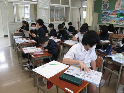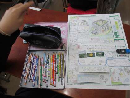 理科の学習では、「地球新聞」という題で環境問題についてまとめています。冊子をもとに、自分が伝えたいことに関係のある情報だけを抜き出しています。また、1組では国語科「世界に向けて意見文を書こう」の学習でも新聞づくりをしました。