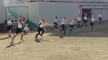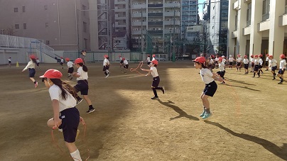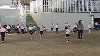 時折、運動場の砂を巻き上げる風が吹く中、子どもたちは元気いっぱい運動しました。火曜日恒例の3分間走の後は、縄跳びタイムです。駆け足跳びで走ったり、前回し両足跳びでピョンピョン進んだり…。後ろ回し両足跳びでバックしながら進んだり、ケンケンパッをしながら進んだりと、新しい跳び方も発明しました。