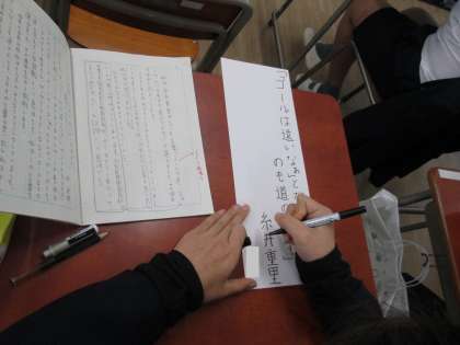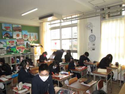 国語科「いにしえの言葉に学ぶ」の学習では、先週から作文を書いています。印象に残った格言や言葉を1つ選んで、自分の経験と関連付けて作文を書きました。2組では今日全員が作文を書き終え、みんなで読み合いました。また、その言葉を一人一人が短冊に書き、教室に掲示しました。たくさんの言葉の中で、印象に残るものはありましたか?ぜひ自分の生活に活かしてほしいです。