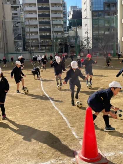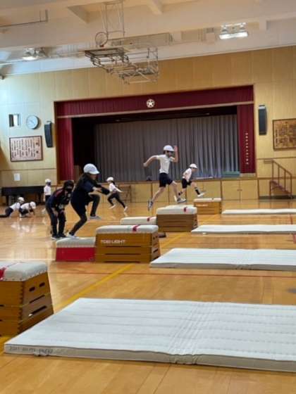一生懸命にボールを追いかけたり、とび箱から高くジャンプしてとび降りたり、子どもたちは寒さに負けず、体を動かしています。