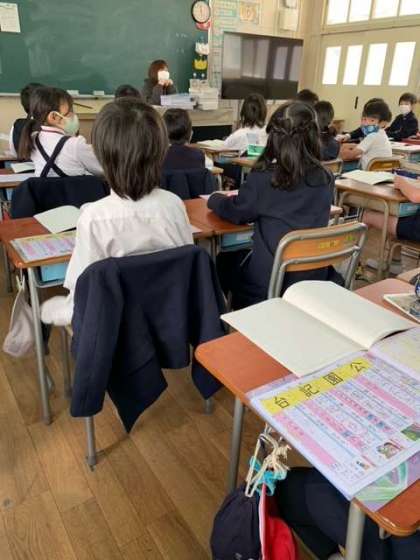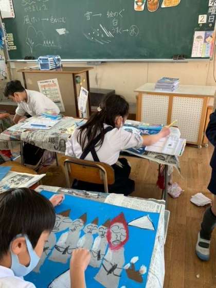 1組は、図画工作科の時間です。「かさこじぞう」の絵を描いています。先週から4時間かけ、想像力をフル活用し表現中。やっぱり、じぞうさまにかさこや手ぬぐいをかけている場面絵を選んだ子が一番多いようです。2組は、漢字スキルとノートを広げ、一文字ずつ丁寧にお稽古しています。誰の話し声も聞こえないくらい、静かに取り組んでいますね。3組は、国語科「かさこじぞう」の音読をしている様子です。「、」や「。」に気をつけて、言葉の意味を確かめながら読みましょう。長いお話ですが、頑張ってくださいね。